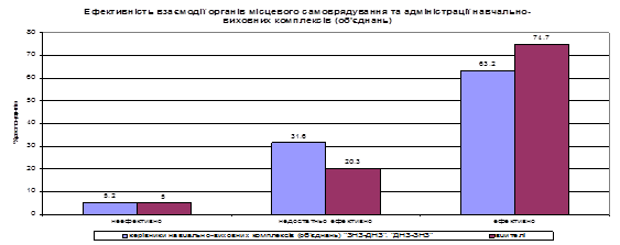 Дані анкетування свідчать про те, що в регіонах організована взаємодія органів місцевого самоврядування та адміністрації навчально-виховних комплексів (об'єднань), яка є ефективною на думку 63,2% керівників і 74,7% педагогічних працівників навчальних закладів (діаграма 5).