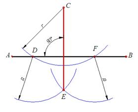 із цих точок описують дві дуги кола радіусом R, дещо більшим половини відрізка DF, до перетину в точці Е;