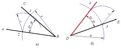 Нехай даний кут АВС. Необхідно побудувати такий же кут, але зі стороною DE і вершиною в точці D. Для цього: із вершини В даного кута проведемо дугу кола довільного радіусу R, яка пересікає сторони 1 і 2; з вершини D шуканого кута тим же радіусом R проведемо дугу кола, яка пересікатиме відрізок DE в точці 3; з точки 3 проведемо дугу радіусом r, який дорівнює довжині відрізка 12, до перетину з раніше проведеною дугою радіуса R в точці 4; через отриману точку 4 і точку D проводимо сторону шуканого кута, якої не вистачає (див. рис.2.2).