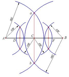 з кінців відрізка А і В циркулем проводять дві дуги кола радіусом R, дещо більшим від половини відрізка, до взаємного перетину в точках а і b;