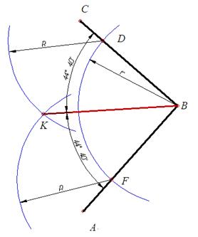 з отриманих точок проводять дві дуги радіуса R, величина якого більша половини довжини дуги DF, до взаємного перетину в точці К;
