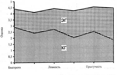 Отримані показники оцінки свідчать про те, що на уроках фізичної культури, всі учні виконуючи програму фізичного виховання і учні, які ще додатково відвідують спортивні заняття в секціях, групах спортивних шкіл, показують задовільні учбові показники в фізичному вихованні. Однак, школярі, які займаються спортом мають показники з фізичної підготовленості значно вищі. таблиці 5, видно, що у школярів середнього віку значні зміни спостерігаються у зрості за показниками якостей швидкості, спритності та гнучкості. Отримане значення t - (5,1, 7,39, 7.5) більше граничного (2,10), що свідчить про наявність достовірної відмінності між показниками в експериментальній і контрольній групах при р - 0,05. Це дозволяє стверджувати про те, що учні середнього шкільного віку, покращуючи показники в швидкості, спритності і гнучкості на додаткових спортивних заняттях в цілому мають вищий рівень фізичної підготовки порівняно з тими, які не займаються.