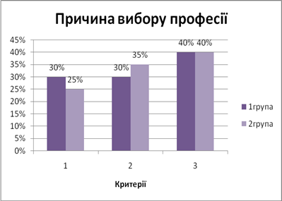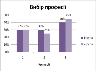 Аналіз отриманих даних показав, що багато школярів ще не визначилися з вибором професії, а з тих, хто визначився, багато хто мало знає про вибрану професію і про те, де її можна отримати. На велику увагу заслуговує і критерій причини вибору професії - більшість опитаних вважає за краще інтересу до професії її престижність і висока заробітна плата. Проте, як було сказано вище, це не завжди виявляється кращим.