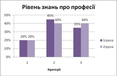 Співвідношення результатів анкетування експериментальної (1 група) і контрольної (2 група) груп добре видно на графіках (Рис. 2.1.)