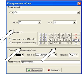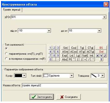 . Для цього натискаємо на кнопку „Побудова графіка функції” і вводимо відповідні значення у вікні „Конструювання об’єкта”: