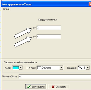6. За допомогою вкладки „Конструювання об’єкта” визначаємо координати утвореної точки, тобто розв’язок заданої системи рівнянь.