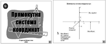 Обладнання: комп’ютерний клас, комплект слайдів „Прямокутна система координат”, який є презентацією Microsoft PowerPoint.
