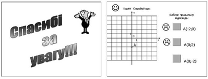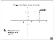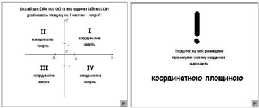 Перегляд слайдів. Під час перегляду кожен слайд супроводжується відповідними коментарями з боку вчителя. Учні, переглядаючи слайди, записують в робочі зошити повідомлення із позначкою „!:” та будують систему координат, в якій позначають координатні чверті, а також запропоновані точки.