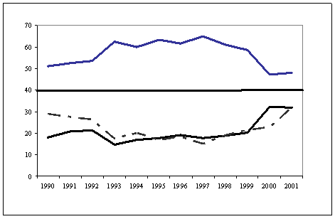 З огляду на вищезгаданий принцип, тенденцію падіння витрат держави на підтримку загальноосвітніх програм необхідно оцінити як негативну. Ця тенденція та відповідно динаміка урядових витрат на вищу освіту наведені на рис. 1. Чітко простежується, що тенденція падіння обсягів фінансування загальноосвітніх програм віддзеркалює (штрих пунктирна лінія майже співпадає з динамікою фінансування вищої освіти) тенденції зростання обсягів фінансування вищої освіти. Це свідчить про те, що приріст обсягів фінансування вищої освіти відбувається за рахунок перерозподілу коштів у межах одного їх ліміту, тобто зменшення обсягів фінансування загальноосвітніх програм, а не за рахунок збільшення обсягів фінансування освіти в Україні. Вищі навчальні заклади через ряд об’єктивних та суб’єктивних факторів більш вдало лобіюють свої потреби при формуванні Державного бюджету України. У цей же час інтереси шкіл і середніх навчальних закладів майже не враховуються.