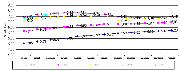 Вважаємо за необхідне звернути увагу на те, що в Україні середні нарахування за ЖКП на одного власника особового рахунку в січні 2005 року виросли на 1,6 % порівняно з аналогічним періодом 2004 року [7] і становили 21,9 % середньомісячної заробітної плати штатного працівника, зайнятого в галузі економіки. Зазначимо, що в розвинених країнах, країнах з перехідною економікою оплата ЖКП не відіграє такої великої ролі в бюджетах домогосподарств і коливається від 3,4–3,7 % (Фінляндія і Швеція) до 9,2 % (Австрія) сукупного сімейного доходу. На думку фахівців, частка платежів за ЖКП не повинна перевищувати 10 % від сімейного доходу, оскільки за межами цієї цифри починається зростання неплатежів. Наочно динаміку заборгованості населення з оплати ЖКП 2000 – 2004 років подано на рис. 1. Термін заборгованості населення з оплати ЖКП на 10 лютого 2005 року становив 7–6 місяців, тоді як на 10 лютого 2004 року – 8 місяців.