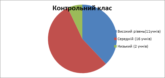 В контрольному класі результати трошки кращі: 38% (16 учнів) мали високий рівень читання, 55% (16 учнів) - середній, і лише 7% (2 учні) не вміли читати слова злито.