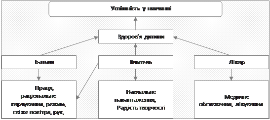 Але успішність у навчанні та зміцненні здоров’я дітей колектив передбачає не тільки в активізації своєї діяльності, а й у співпраці з батьками та медичними працівниками (Рис. 1.1).