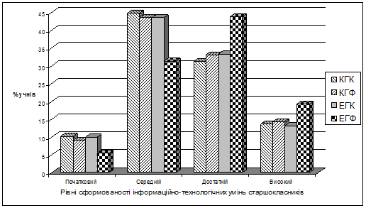 4. У процесі дослідження визначено чотири рівні сформованості інформаційно-технологічних умінь: початковий, середній, достатній, високий. До критеріїв, за якими виявлятимуться рівні сформованості інформаційно-технологічних умінь, віднесено: інформаційно-технологічні знання, уміння роботи з інформацією, уміння інформаційно-технологічної діяльності. Діагностування рівнів сформованості інформаційно-технологічних умінь учнів було проведено за результатами тестування (інформаційно-технологічні знання) та виконання учнями контрольних робіт (уміння роботи з інформацією та уміння інформаційно-технологічної діяльності).