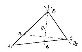 Побудувавши в довільної прямий відрізок, дорівнює підставі, одержимо дві вершини трикутника: А1 і З1. Знаючи кут З1А1У1, ми можемо знайти й положення крапки D1, де D1А1 = В1А1 – В1С1. Залишається розглянути, як побудувати крапку В1 знаючи положення крапки D1. Тому що З1У1 = В1D1, то крапка В1 равноудалена від крапок З1 і D1, тому вона повинна лежати на перпендикулярі Р1Q1, проведеному до відрізка З1D1 через його середину. Крапка перетинання прямій Р1Q1 і лучачи А1D1 і буде крапкою В1. Отже, приходимо до наступної побудови. На довільній прямій відкладаємо відрізок, дорівнює підставі, і будуємо кут, рівний даному, одна зі сторін якого містить побудований відрізок, а вершина збігається з кінцем цього відрізка. На другій стороні кута відкладаємо відрізок, рівний різниці двох інших сторін трикутника, і будуємо геометричне місце крапок, равноудаленных від відповідних кінців підстав і побудованого відрізка. Крапку перетинання цього геометричного місця зі стороною кута, що містить різниця, з'єднуємо з кінцем підставі й одержуємо шуканий трикутник.