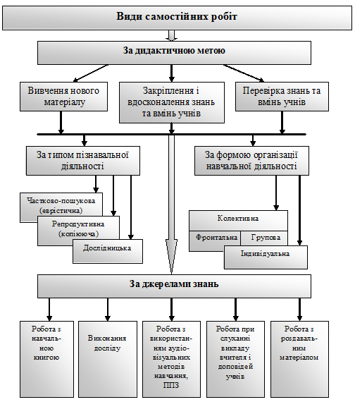 Окремі види самостійної роботи можуть включати або все, або деякі з цих елементів. Чим більше вказаних вище елементів входить в самостійну роботу учнів, тим вище її рівень, а значить, і рівень самостійності школярів.