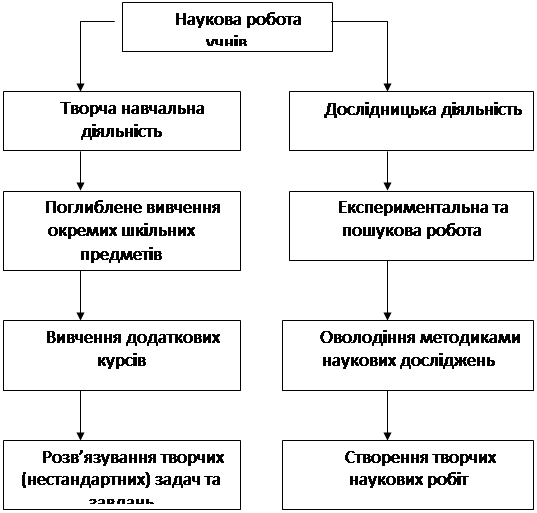 - науково-дослідницька діяльність, що доповнює навчальний процес: факультативи, спецкурси, гуртки;