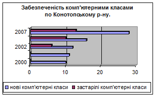 Аналіз діаграм дозволяє зробити висновки, що у сільській школі, починаючи з 2002 року, спостерігається тенденція «морального старіння» засобів ЕОМ, яка з роками зростає. Тому, управлінцям необхідно пам’ятати, що через 3 роки комп’ютерна техніка починає «застарівати», і вчасно звертати увагу на модернізацію комп’ютерної техніки, залучаючи бюджетні та спонсорські кошти.