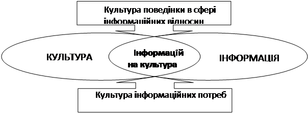 Професійно-педагогічна культура вчителя є відкритою системою. Розвиток цієї інтелектуальної системи залежить від ступеня надходження, опрацювання й ефективного використання інформаційних потоків із навколишнього середовища. Останнє означає, що сучасний учитель має бути відкритим до сприйняття інформації. З огляду на перенасиченість її в сучасному суспільстві, складність і різноманітність інформаційних технологій він має володіти високим рівнем ІК. Очевидно, що поняття ІК генерується двома фундаментальними поняттями: культура та інформація, відтворюючи їх взаємозв’язок і взаємовплив (рис.1.).