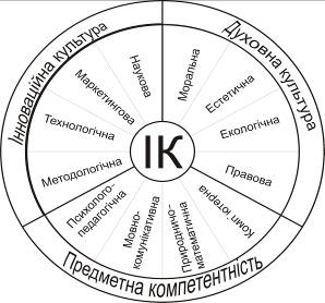 Враховуючи різні підходи дослідників до визначення поняття ІК та її місця в професійній культурі вчителя, пропонуємо своє бачення цієї структури (рис.2). ІК зображена в центрі схеми, оскільки вона є „джерелом живлення” всіх інших структурних компонентів професійної культури вчителя. Вплив ІК на кожну із підсистем професійної культури майбутнього вчителя можна довести. Наприклад, пошук наукової інформації, ознайомлення з науковими методами її обробки, збирання, дослідження, аналіз і зіставлення певних фактів, понять, явищ розвивають наукову культуру студента. Систематичне застосування ІТКТ для пошуку, відбору, інтегрування, структурування і створення власної інформації розвивають предметну компетентність, технологічну й методологічну культуру майбутнього вчителя.