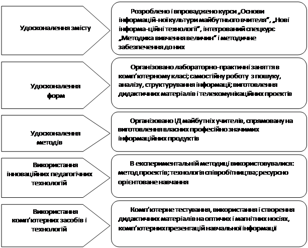 Напрями експериментальних пошуків представлено на рис. 4. Методами математичної статистики доведено, що експериментальна методика позитивно вплинула на формування бібліографічної культури та розвиток загальнонавчальних умінь і навичок, готовність студентів до інтегрування різнопредметної інформації, ефективність розвитку комунікативної культури у процесі здійснення ІД, рівень комп’ютерної грамотності та формування навичок використання мережі Інтернет. В експериментальних групах спостерігалася значна динаміка готовності студентів до самоосвітньої ІД під час навчання у ВНЗ.