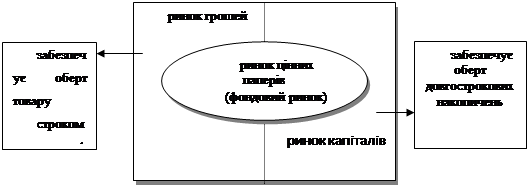 Також важливо показати учням, що фінансовий ринок складається з грошового ринку та ринку капіталів. Його структура (мал. 2.9.) може бути проілюстрована за допомогою кодоскопа при першому ознайомленні з цінними паперами для розуміння місця цінних паперів у фінансовому колі питань. На грошовому ринку обертаються засоби, які виступають короткостроковими фінансовими коштами. Ринок капіталів – це ринок середньо - та довгострокових накопичень. Межа між ними дуже умовна, бо між цими ринками постійно відбувається перебіг коштів.