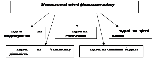 Використовуючи фінансові дані у математичних задачах фінансового змісту можна поступово знайомити учнів із фінансовим станом країни, з проблемами держави та шляхами розв‘язання проблем власного характеру. Таким чином, основні задачі, які можуть використовуватися в процесі вивчення математики в середній загальноосвітній школі, можуть бути розподілені за мал. 1.1.