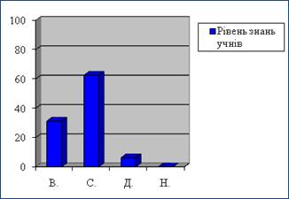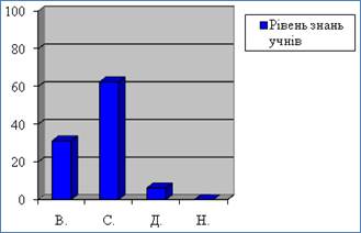 На початку експерименту високий рівень мали 4 учні, а після проведення експерименту ми бачимо, що високий рівень зріс. Також і з середнім рівнем. На початку він складав 25%, а тепер 62,5%. Достатній рівень, навпаки, зменшився. Низький рівень взагалі відсутній.