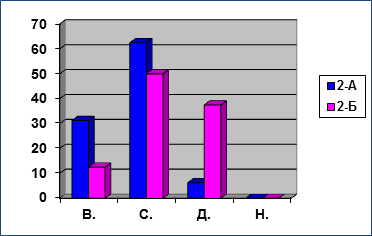 Порівнявши отримані дані між експериментальною групою та контрольною. Ми побачили, що рівень знань 2-А класу вищий ніж у 2-Б класу.