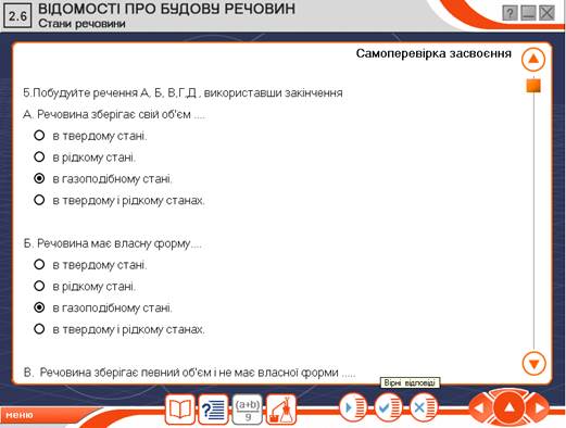 (Учні проходять перевірку засвоєння навчального матеріалу даної теми із використанням навчальної програми „Фізика, 7клас”, аргументуючи класу свої відповіді, а потім звіряють власні відповіді із вірними, зазначеними програмою. Див. мал.5)
