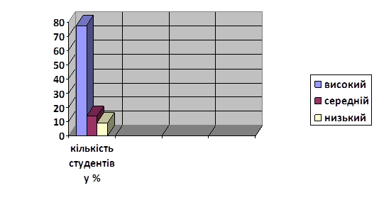 За рисунком 2.1 ми бачимо, що у 77,3 % студентів рівень сформованості педагогічної фасилітації високий, у 13,7% середній і у 9% - низький.