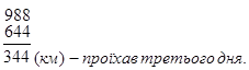 Протягом трьох днів шофер проїхав 988км. За перші два дні він проїхав 644км, за другий і третій - також 644км. Скільки кілометрів проїхав шофер другого дня?