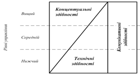 Зазначені якості необхідні на різних рівнях управління організацією у різному ступені (рис. 1.5.).