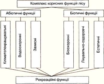 Під екологічною функцією лісів, як еколого-економічної системи, розуміють рекреаційну (оздоровчу) цінність лісових масивів, захист ґрунтів від ерозії, підвищення урожайності сільськогосподарських культур, регулювання водостоку, продукування кисню та ін. Лісові біогеоценози впливають на оточуюче середовище як біологічна система, виділяючи в зовнішнє середовище речовину та енергію в процесі фотосинтезу, дихання, транспірації та ін. Крім того, лісові фітоценози - це фізичні тіла, які займають певне місце і мають масу із специфічними для неї властивостями. Вони відбивають і поглинають сонячну радіацію, затримують частину атмосферних опадів, конденсують водяну пару, затримують пил, переводять поверхневий стік у внутрігрунтовий та ін.