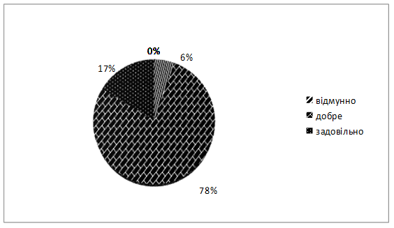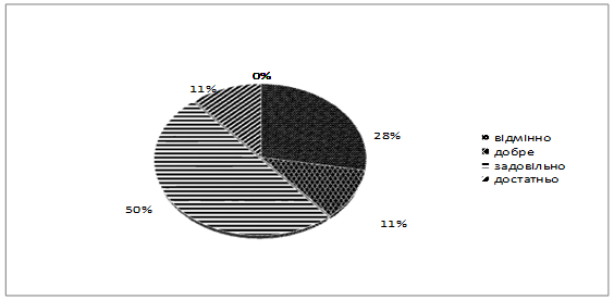 Проаналізувавши результати тесту для оцінювання орієнтації в просторі ми дізналися, що відмінний результат показали п’ять учнів, добре показали два учні, задовільний результат показали вісім учнів, достатній результат показали три учні (рис. 3.15)