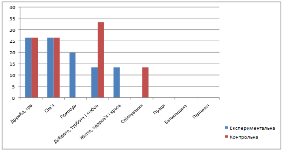 Проаналізувавши результати ми отримали такі дані : у контрольній групі 66,7% дітей не важливими вважають Батьківщину, людину, спілкування та пізнання; 26,6% тільки людину і пізнання, і одна дитина (6,7%) обрала пізнання. У експериментальній групі ситуація значно краща. Троє дітей (20%) обрали всі цінності важливими, 53,2% вибрали не важливими пізнання і Батьківщину, 13,4% пізнання, і 13,4% людину.