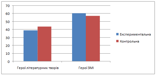 Результати дослідження занесені в таблицю ( Див. Додаток Б). Опрацювавши результати ми виявили, що і в експериментальній групі 39,6% дітей улюбленими героями вважають героїв літературних творів, та 60,4 % супергероїв мультфільмів та кіно. Результати контрольної групи мають не значні відмінності – 42,8% обрали улюбленими літературних героїв, та 57,2% - героїв мультфільмів і кіно. (Див. Рис. 2) .