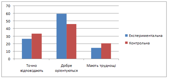 Опрацювавши результати ми виявили, що 26,4% дітей експериментальної групи найбільш точно відповіли на питання, 59,4 % дітей іноді не могли пояснити одне чи декілька понять, і 14,2 % дітей мали значні труднощі або не змогли відповісти. У контрольній групі точно відповіли на питання 33,3% дітей, деякі неточності у відповідях мали 46,2% та 20,5% не змогли відповісти або відповідали не вірно (Див. Рис. 3 ).
