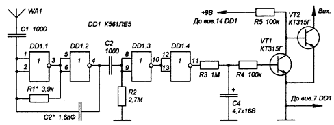На рис.21 зображено схему "детектора наближення" на основі ємнісного реле. На елементах DD1.1, DD1.2 виконано мультивібратор. При налагодженні, значення резистора R1 та конденсатора C1 зменшують доти, доки генерація (при приєднаній антені) не зірветься. Коли наблизити руку до антени WA1 (нею може бути металевий предмет), - генерація повинна відновитись. Елементи DD1.3, DD1.4 підсилюють та формують частотний сигнал. Конденсатор C4 унеможливлює короткочасні хибні спрацювання. Провідники, що з'єднують антену з пристроєм сигналізації, потрібно робити якомога короткими.