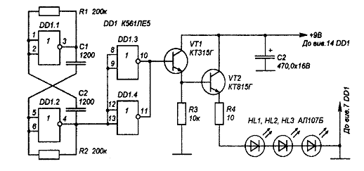 Резистори R1, R2 приєднані між входами та виходами елементів мікросхеми, забезпечують м'який режим збудження. Паралельно приєднані елементи DD1.3, DD1.4 зменшують вплив навантаження на режим робити мультивібратора. Транзистори VT1, VT2 утворюють підсилювач потужності. Це два емітерні повторювачі, з'єднані послідовно. Для досягнення максимального підсилення струму треба, щоб наступний транзистор був потужнішим від попереднього. Резистор R4 обмежує струм через світлодіоди HL1 – HL3.