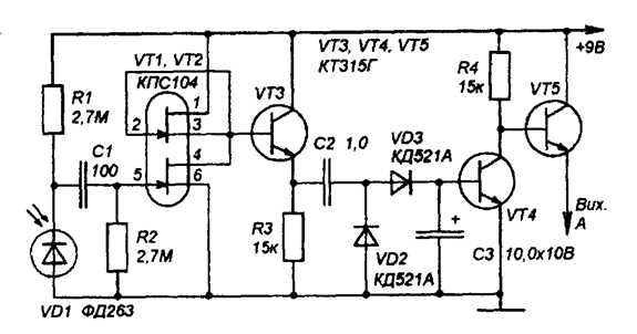 На рис. 23 показано схему приймача ІЧ променів. Фотодіод працює у фотодіодному режимі (є ще фотогенераторний режим). При освітленні опір фотодіода зменшується і на його виводах з'являється електрорушійна сила, пропорційна до освітлення. Конденсатор С1 усуває вплив ймовірних повільно змінних джерел на режим роботи. На збірці з двох польових транзисторів типу КПС104Г створено послідовно балансний каскад, коефіцієнт підсилення якого становить 300-400. Така схема потребує великого вхідного опору в наступному каскаді, має малу верхню частоту пропускання. На транзисторі VT3 реалізовано емітерний повторювач з великим вхідним та малим вихідним опорами. На діодах VD2, VD3 виконано амплітудний випрямляч з подвоєнням напруги. Транзистор VT4 підсилює та інвертує випрямлений сигнал. До емітера транзистора VT5 (вихід A) можна приєднати виконавчі пристрої звукової та світлової сигналізації.