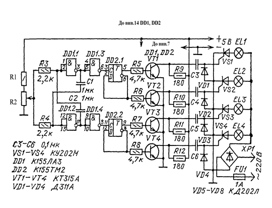 Перемикач гирлянд. На мікросхемі DD1 (рис.24) зібрано симетричний мультивібратор частоту коливань якого можна змінювати в межах 195-205 Гц змінним резистором R2. Через інвертори DD1.3 і DD1.4 прямокутні імпульси мультивібратора надходять на тригери DD2.1 та DD2.2 (вони виконують роль подільника частоти). Вихідні сигнали тригерів надходять на підсилювачі струму VT1-VT4, а дальше, через конденсатори С3-С6 на управляючі електроди тиристорів VS1-VS4, в анодні кола яких включені гирлянди ламп EL1-EL4.