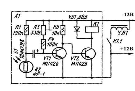 Чутливим елементом фотореле (рис.26) є фоторезистор R2, величина опору якого безпосередньо залежить від інтенсивності його освітлення. До моменту, коли на фоторезистор не попадає світлова "куля" опір його досить великий і струм в колі подільника, утвореного цим же резистором, є досить малий. При цьому транзистор VT1 є відкритим (цього досягають, при налагодженні, підбором величини резистора RЗ), а VT2 – закритий; реле К1 - знеструмлене.
