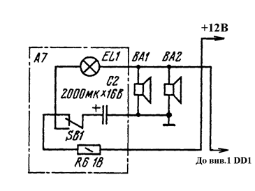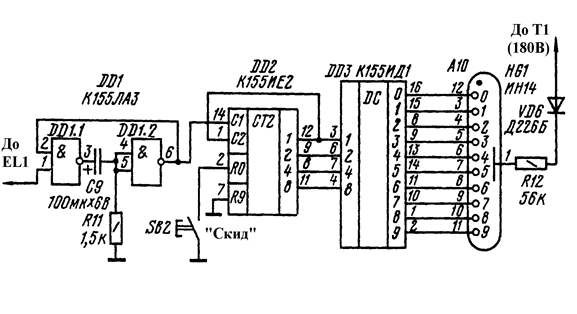Одночасно з пострілом включається в роботу вузол А9 (рис. 29). На його вході стоїть мультивібратор, виконаний на елементах DD1.1 i DD1.2. Запускається він імпульсом, який формують динамічні головки.