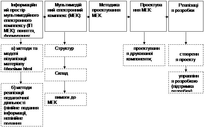 1. Методи і моделі мультимедійного електронного комплексу: поняття, формування 1.1. Методи та моделі візуалізації матеріалу (фрейми html, аудіо, анімації) 1.2. Методи реалізації педагогічної діяльності (лінійне подання інформації, нелінійне подання інформації) |