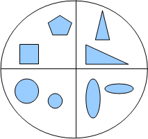 Тут теж застосовуються саморобні посібники. Вони мають вигляд поділеного на 4 частини круга з геометричними фігурами.