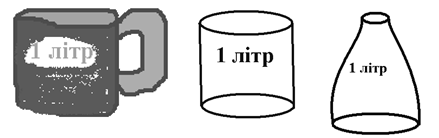 – Як ви гадаєте, скільки літрів поміститься в кожній з цих посудин? Учні називають числа, а вчитель перевіряє їх, наливаючи воду в цей посуд літровою банкою.