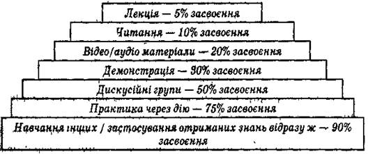 З піраміди видно, що найменших результатів можна досягти за умов пасивного навчання (лекція — 5%, читання — 10%), а найбільших – інтерактивного (дискусійні групи — 50%, практика через дію — 75% навчання інших чи негайне застосування — 90% ). Це, звичайно, середньостатистичні дані, і в конкретних випадках результати можуть бути дещо іншими, але в середньому таку закономірність може простежити кожен педагог.
