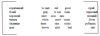 -Зараз ми пограємо у словниковий футбол. На дошці поле з словами-м’ячами, по краям – ворота. Вам потрібно забити гол у ворота іншої групи, тобто до слова у воротях дібрати з поля переклад - м'яч. Зараз протягом 1 хвилини ви можете поспілкуватись в групі і визначити, які слова вам потрібно назвати. Потім називаєте по однму слову з поля і його переклад з воріт по черзі. Якщо це зроблено вірно, то група "забиває гол". Будьте уважні, щоб не забити гол у свої ворота. Ваша хвилина почалась.