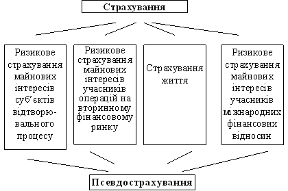 В умовах перехідної економіки, яка набирає ознак „віртуальної”, страхування трансформується у псевдострахування, що має такі форми прояву, як зарплатне і зворотне медичне страхування, організація фінансових „схем” для підприємств за допомогою майнового страхування, що не забезпечуються резервами та значним власним капіталом.