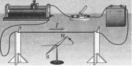 На початку слід повідомити учням деякі історичні факти даного досліду: «Ще вчені Давньої Греції висловлювали припущення, що магнітні й електричні явища якимось чином пов'язані між собою, проте встановити цей зв'язок удалося лише на початку XIX ст. Данський учений X. Ерстед демонстрував студентам досліди з нагріванням провідників електричним струмом. Під час одного з дослідів він помітив, що при проходженні електричного струму по провіднику магнітна стрілка, розташована поблизу провідника, відхиляється від напрямку «північ — південь». У разі ж відсутності струму стрілка знов встановлюється вздовж ліній магнітного поля Землі. Так учений з'ясував, що електричний струм чинить певну дію на магнітну стрілку.